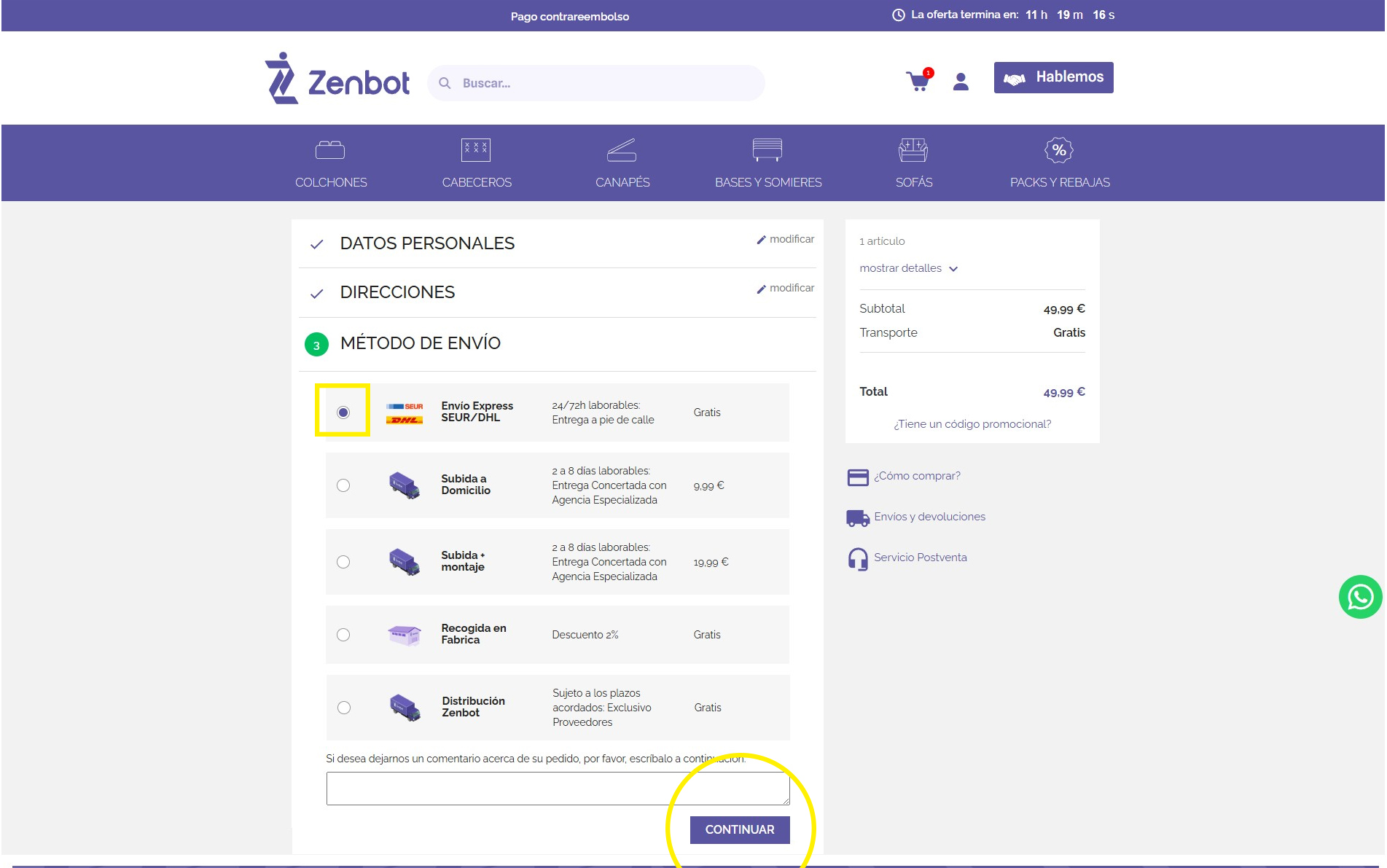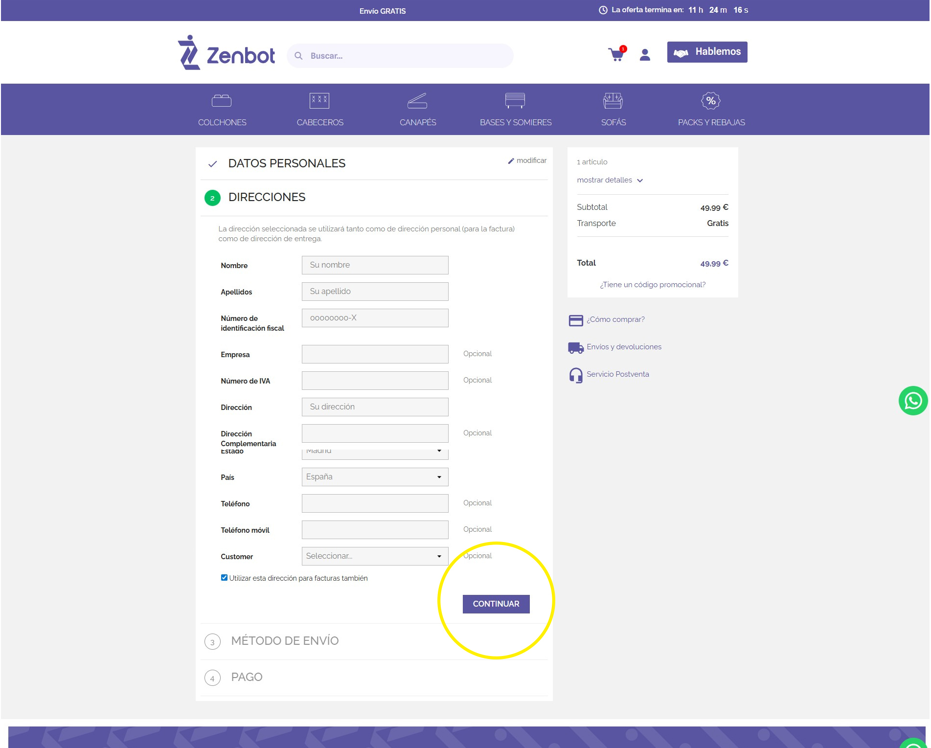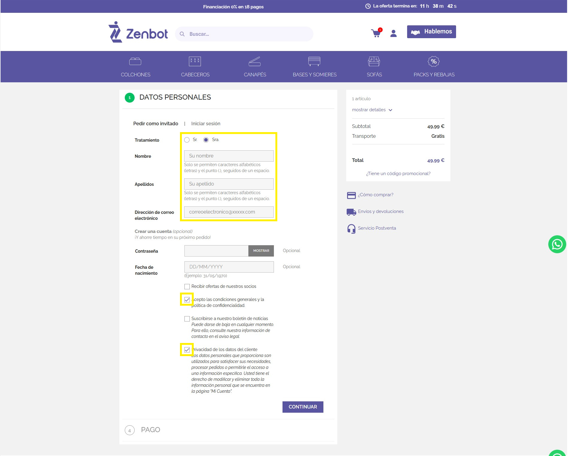 4. En la siguiente pantalla es para conocer sus datos personales, puede rellenarlos con sus datos como nombre, apellidos y correo electrónico. La opción de crear una cuenta es opcional, pero si la crea ahorrara tiempo en su próximo pedido. Debe de aceptar las condiciones generales y la política de privacidad de datos para continuar, posteriormente accione el botón continuar.